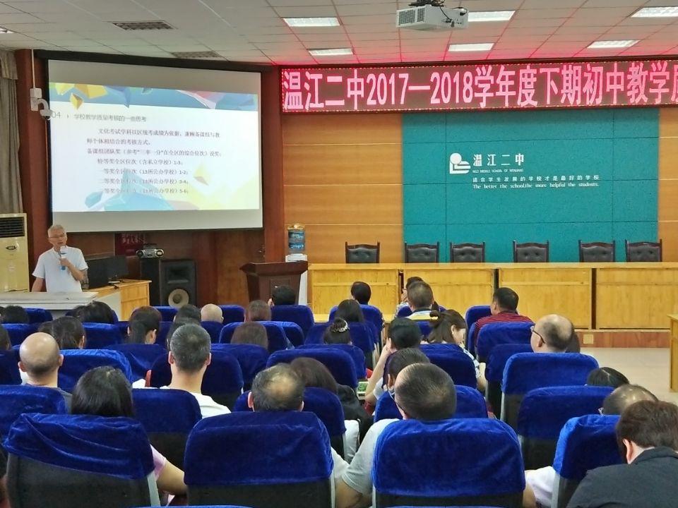 为突出教学中心工作,加强质量监控,认真做好教研,同时也是为了检查全面落实年中有关教学质量提升工作进展情况,经学校统一安排,我校初中部于2018年7月9日下午2:30,召开了本学期期末考试质量分析会。 [详细]