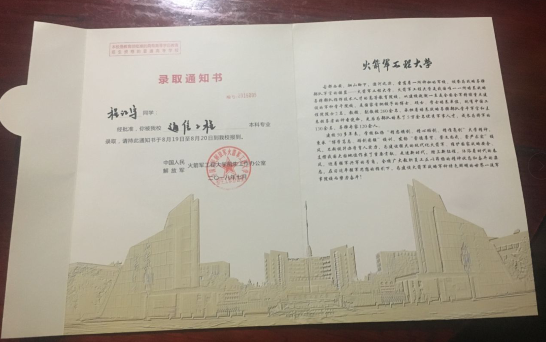 青春、梦想、奋斗,二中学子在今年的夏季绚烂夺目! 祝贺我校高2018届学子在今年高考中表现优异,被各大高校录取。提前批——军校篇 发奋努力,立志从军报国,梦想成真!中国人民解放军火箭 [详细]