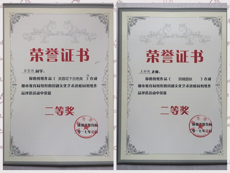 在成都市教育局组织的2017川剧文化艺术进校园剪纸作品展评中,温江二中学生在美术教师王新艳指导下创作的剪纸作品喜获佳绩: 一等奖: 王欣瑶《韵》 二等奖: 苏雪雨《芙蓉花下旦绝美》 教师二等奖:王新 [详细]