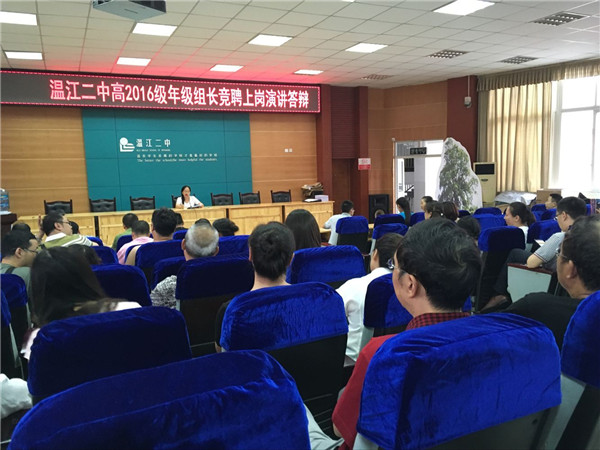2016年7月8日下午,温江二中举行了初2019届年级组长竞聘会。由学校校级干部、中层干部、部分年级组长代表组成的评委团及初2019届全体老师参加了此次竞聘答辩会。 初2019届年级组长竞聘面向全校老师公开选拔, [详细]