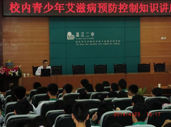 2014年4月23日,温江二中于组织高一年级学生在阶梯教室参加了2014年温江区健康巡讲活动,听了校内青少年艾滋病的预防控制和支持控烟,远离烟草两堂健康知识讲座。区红十字医院淡医生为学生做了校内青少年艾滋病的 [详细]