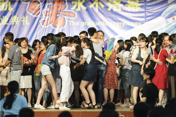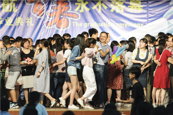 毕业生陈甜甜的发言表达全体毕业生对老师的感谢与感激之情。而典礼最激动人心的莫过于同学们对老师表达感恩和献花的时刻了,老师、学生个个感动得泪流满面。伴随彼此的是感谢、怀念,嘱托和祝福。