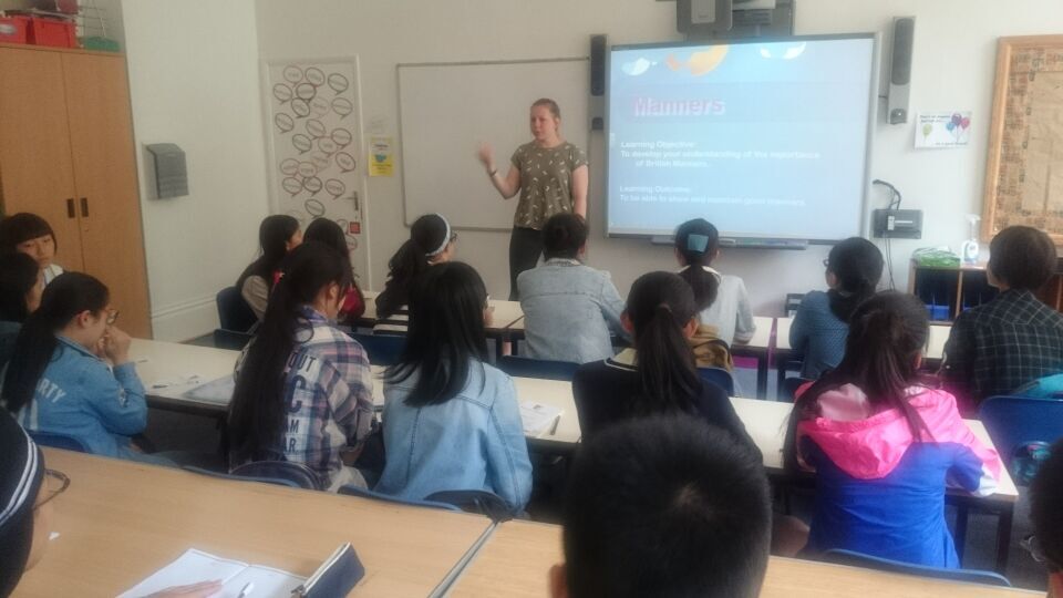 早餐后,访学师生一同在教室里学习英国社交礼仪,圣心学校老师Amy和Ann共同执教。Amy运用多媒体展示在英国日常生活中需要注意的礼貌礼节问题,她鼓励孩子们积极发言,主动融入课堂教学,及时记录新学单词,大胆进行英语对话。通过半天的学习,师生们认识到英语只是我们同英国朋友交流的媒介,它只是表面的东西,要想在英国生活,还得对英国历史文化内涵进行深入地了解。