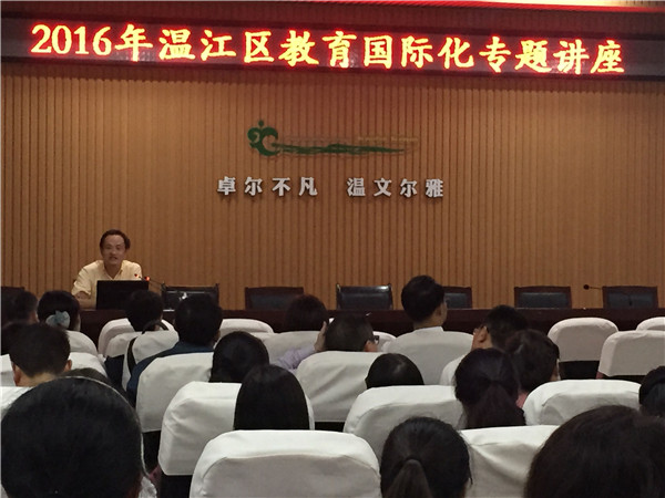 9月22日下午,温江区教育局在区实验学校多功能厅开展2016年温江区教育国际化专题讲座,来自全区各中小学、幼儿园校(园)长、分管教育国际化行政干部、骨干教师近170余名人员参会。温江二中对外交流办公室主任李晓君带领白冰、杨珍等5人参加会议。