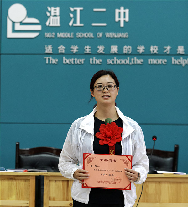 我校“走特色之路,让学生发展”,艺体教育硕果累累,艺体教师人才辈出,徐黎就是其中一员。徐老师认认真真教学,扎扎实实训练,不怕苦不惧累,主训初中男子排球队代表温江区参加市第十三届运动会青少年组排球比赛,获得冠军,为我区勇夺一金,为我校再添光彩。在此,学校将本年度“特别贡献奖”授予徐黎老师!