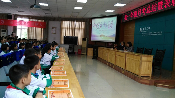 10月14日,初一年级全体师生在阶梯教室召开了初一年级第一次月考总结暨表彰会。主题为“越努力,越青春”。