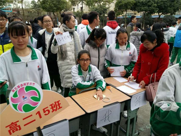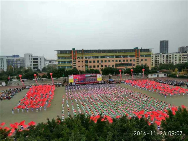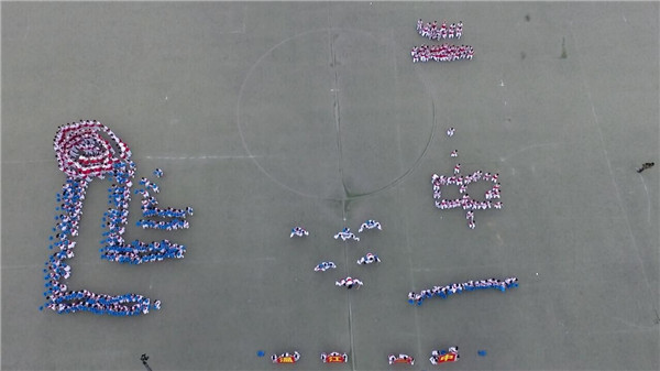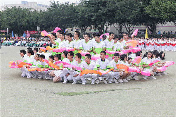 (我校高一年级的学生们用花瓣扇子组成“二”“中”图案,他们灿烂如花的笑颜正绽放着青春的美丽,矫健灵动的身姿正飞扬着青春的活力。)
