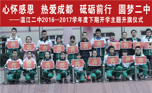 新学期,新气象,新的学期见证新的发展,新的目标迎接新的挑战。2017年2月14日,温江二中全体师生举行2017年春季第一次升旗仪式暨开学典礼,此次升旗仪式的主题是“心怀感恩、热爱成都、砥砺前行、圆梦二中。
