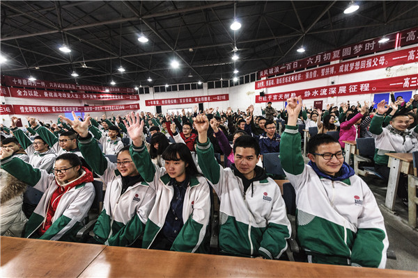 “三年砺剑百日策马闯雄关,一朝试锋两日考场逞英雄。”为充分调动高三毕业班师生冲刺高考的积极性,激发毕业班学生学习激情,营造浓厚的备战高考的学习氛围,2017年2月27日,温江二中在学校多功能厅召开高2017届决战高考百日冲刺誓师大会。大会由年级组长谢刚主持,校长李彦康、副校长袁成及高三全体师生出席了本次会议。