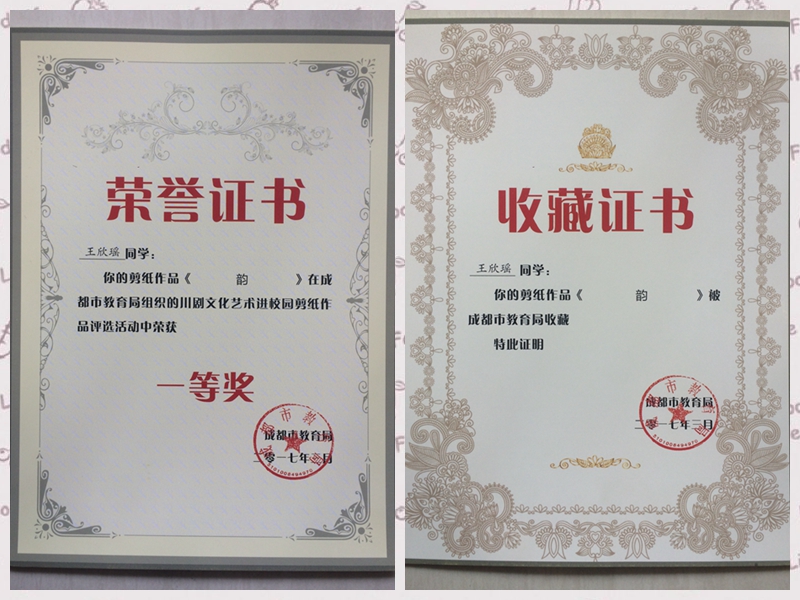 其中王欣瑶同学的剪纸作品《韵》被成都市教育局收藏。