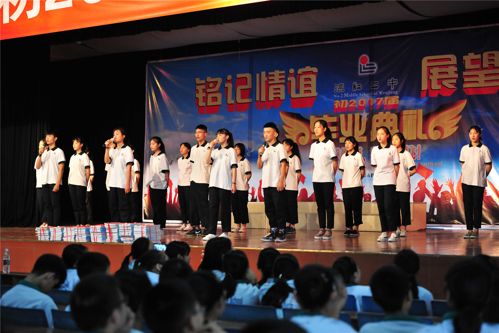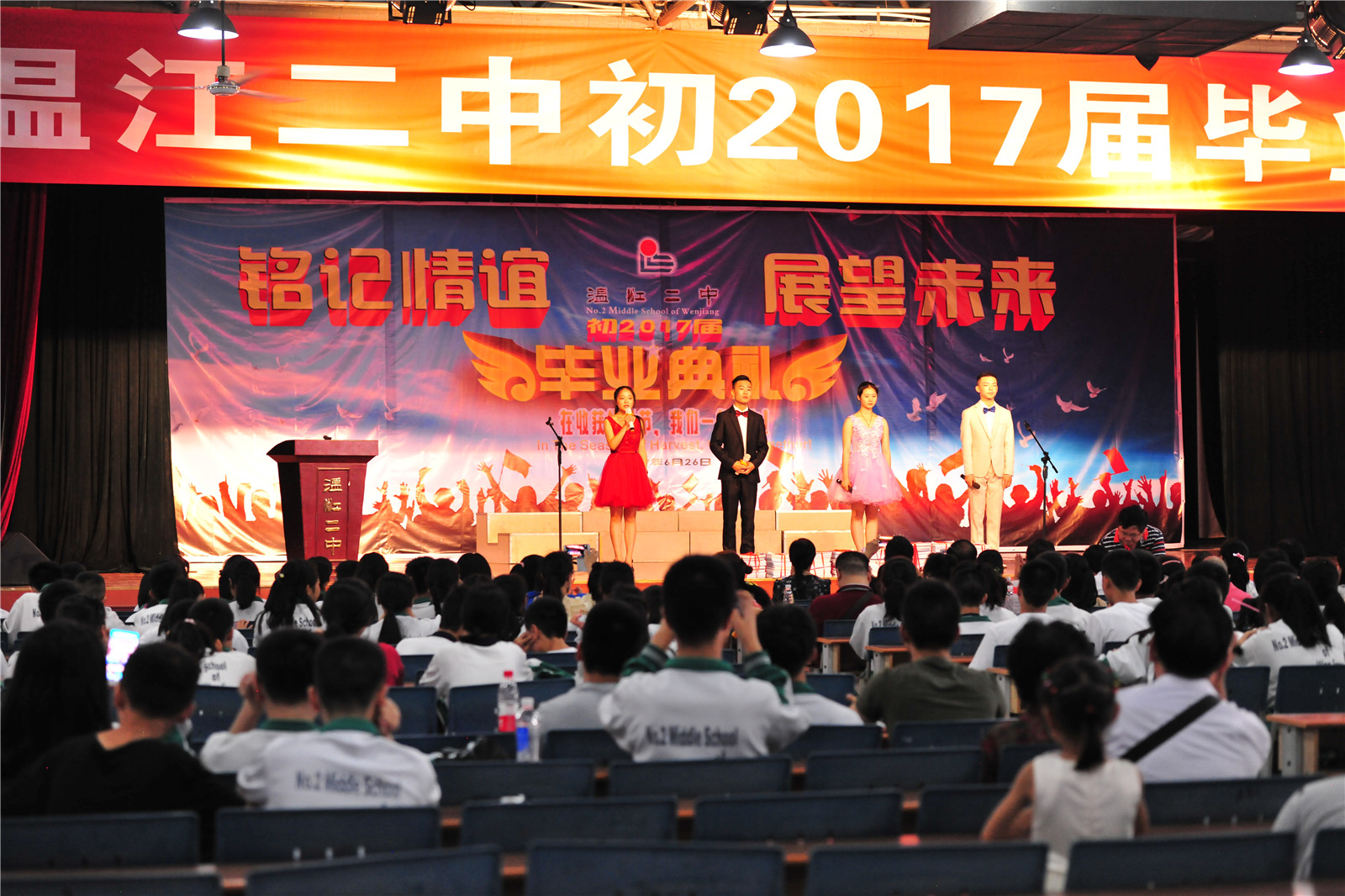 踏进会场,动听的音乐围绕耳畔,舞台两旁的屏幕上,一张张照片,记录着同学们三年来的点点滴滴,勾起同学们最深切美好的回忆。9时30分,毕业典礼正式开始。李军组长为大家介绍了到场的各位校领导,四位主持人回顾了三年初中生活,接着便是同学们精彩的节目表演。节目有合唱《温江二中的日子》,有诗朗诵《今天我们毕业了》《二中,我们永远的家》,有歌伴舞《送别》,他们的表演赢得了大家热烈的掌声。