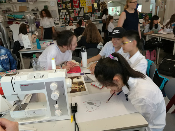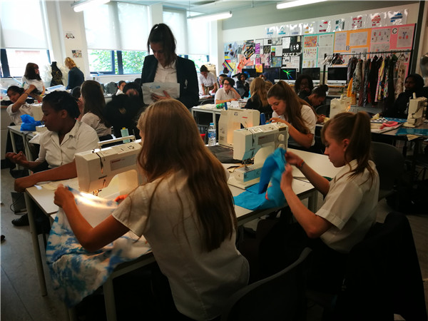 数学课难不倒我们二中的学子们,化学,英语稍稍有些跟不上。人文学科很有意思,讨论的是穷国与富国的GDP,为英国GDP增长献计献策,学生独立思考,小组合作,积极发言,教师总结,整个课堂有序且有效。艺术课让我们耳目一新,艺术教室里,蜡染,缝纫机,印花机,模特,布料,针线等一应俱全,同学们从染色,印花,裁剪到缝纫,整个衣服制作流程全程DIY。在制作过程中收获满满的成就感。