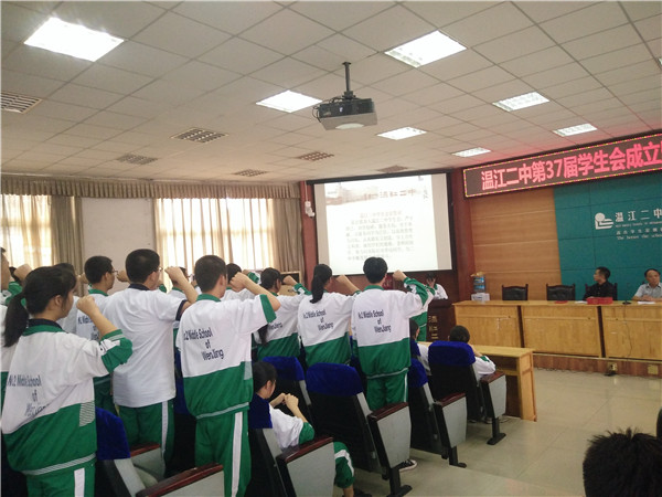 大会在嘹亮的国歌声中拉开序幕,郭校长首先宣布了温江二中新一届学生干部名单,并希望本届学生会全体成员能够在以后的工作中、学习中努力做到最好。全体学生会干部在随后的宣誓中也表达出了信心和决心。为了肯定学生干部的成绩,激励更多的学生干部,随后王主任宣布了上一届优秀学生干部名单,并由出席的领导为他们颁发了荣誉证书。上届学生会主席徐灿凌作为优秀学生干部做了交流发言,寄语新一届学生会成员严于律己,认真履行好职责,增强责任感与使命感。新一届学生会主席许浩雅同学也在随后的发言中表示一定会带领好全体学生会成员做好模范带头作用,一定会恪守承诺,一定会不断积极进取,努力让新一届学生会工作实现更大的进步。