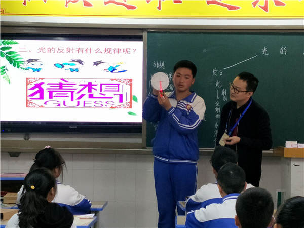 赖勇老师的《光的反射》也从游戏导入,然后通过观察现象、自主设计、动手实验、交流探究、归纳总结、知识应用,层层递进,充分体现了把课堂还给学生,以学生为主体的高效课堂教学模式,有效践行了“行知精神的教学做合一。”