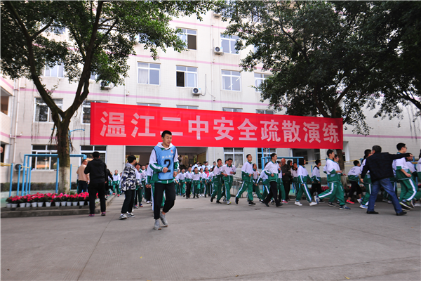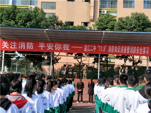 11月7日上午,温江二中成功举行了“‘11·9’消防知识讲座暨消防安全疏散演练”活动。旨在普及消防安全常识,提高师生应急防护自救和逃生能力,强化消防安全意识,积累紧急疏散、消防救助等实战经验。校长季玲、副校长袁淑英、副校长郭久清、校长助理熊书钢、德育主任王强、全体班主任、相关工作人员及全校4000余名学生参加了此次消防疏散演练活动。