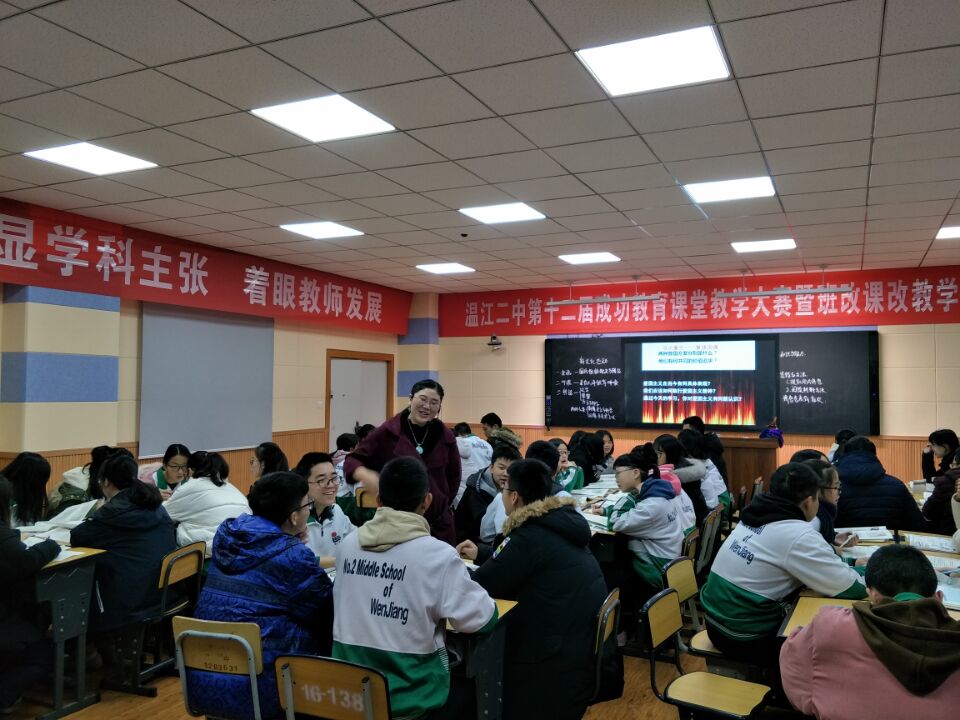 温江二中第十二届成功教育课堂教学大赛暨班改课改教学展示活动拉开帷幕,本校陈英老师代表高中历史组参赛并执教《新文化运动》一课。陈老师独具匠心、智慧创新设计了《新文化运动》一课,并在2017年12月8日星期五上午于学校录播室进行了精彩展示。