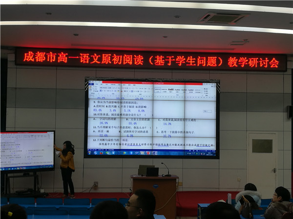 会上,成都七中的刘老师分享了针对成都七中高一学生的阅读现状问题的调查情况,她从问卷设计的意图、内容、结果进行了分析,刘老师提出了阅读教学有三点改进的方向,即从问题入手,提高学生的阅读效率;帮助学生把握语言本质规律的形成逻辑思维;培养学生透过语言现象,理性思考的能力。