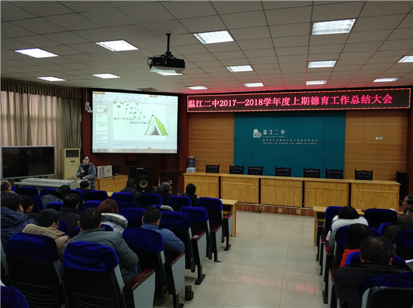 德育是学校教育的灵魂,是学生健康成长和学校工作的保障。因此,我们一直把德育工作摆在重要位置,牢固树立教书育人、管理育人、服务育人的思想,助推学校工作的全面发展。2018年1月30日上午,全体二中德育人齐聚学校阶梯教室,以班级管理、班级文化建设为话题,召开了2017——2018学年度上期期末德育工作总结会暨德育师徒经验交流会。会议由德育处副主任兰宏利主持,校长季玲出席并做工作指导,分管德育副校长郭久清、德育处主任王强及全体班主任全程参与此次活动。