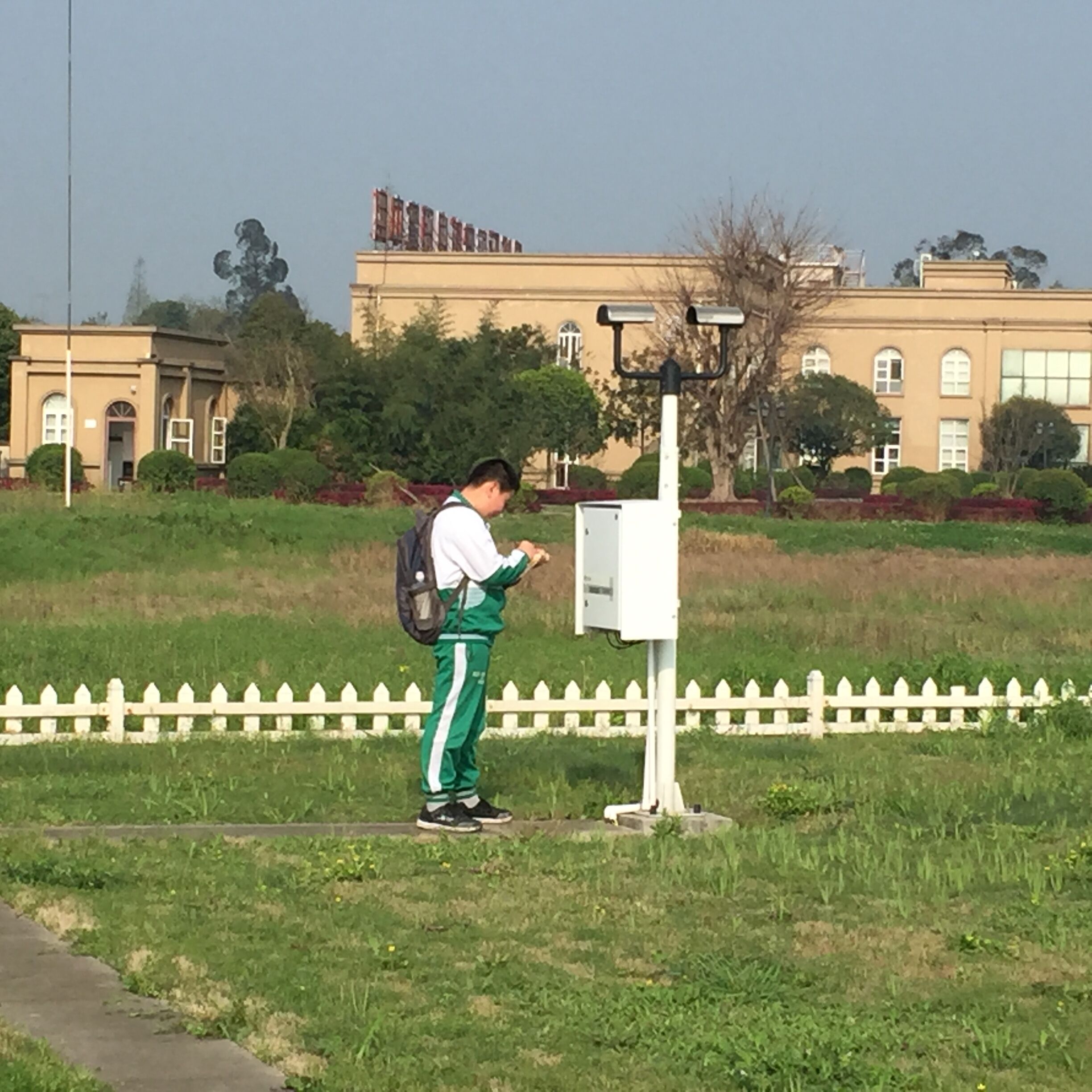 在工作人员的带领下,同学们首先参观了地面观测场,地面观测场是整个气象预报的基础,担负着地面天气观测并实时发报,提供给天气预报需要的定时观测数据,这里仪器齐全,实现了自动化采集各种数据,工作人员通俗易懂的讲解了气象站选址的条件、气象学常识、气象观测仪器与设备,以及如何采集数据、分析气象状况,同学们边听边做笔记,还不时地提出一些问题,工作人员耐心地为同学们一一解答。通过生动的讲解,同学们认识了百叶箱、雨量器、蒸发器、风向标、地下温度表等气象观测的仪器,知道了在室外观测温度、风向等操作方法。