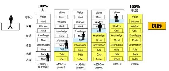 图表1. 人与机器的关系变化(黄色部分是机器可以替代人类的劳动)