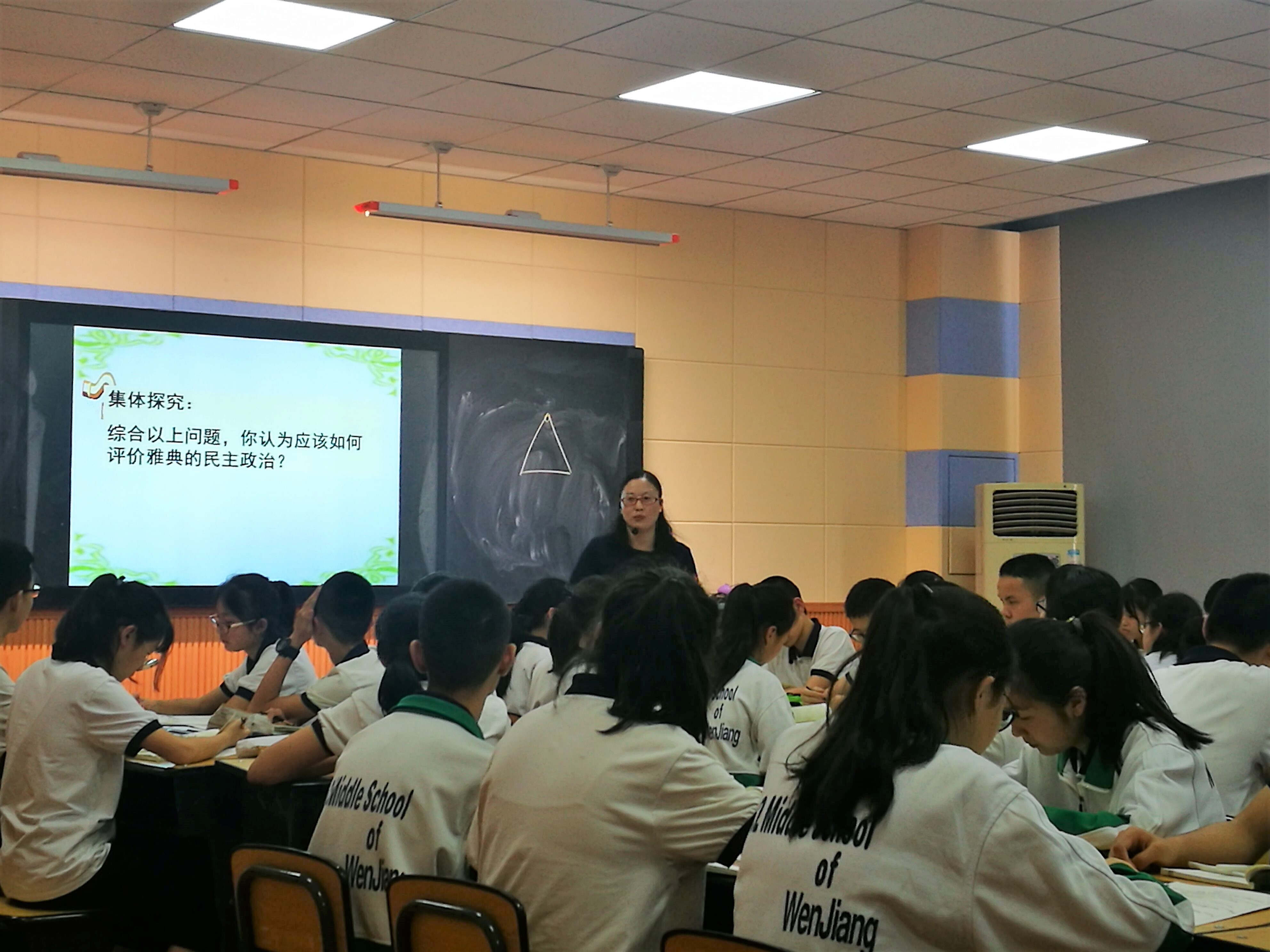 2018年5月24日,唐小艳老师代表温江二中初中历史备课组在多媒体互动教室向区初中历史教师展示了基于学历案的初中历史互动教学研究课《古代希腊—西方民主政治的摇篮》。