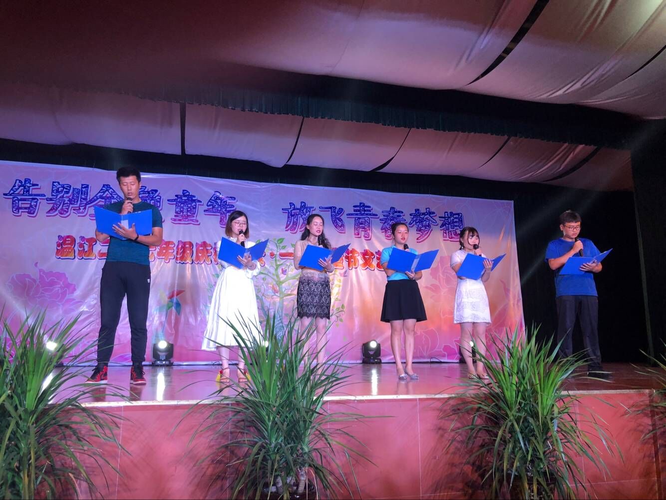 清风吹拂,花朵摇曳,树叶婆娑,在这舒爽的日子里,七年级的同学们迎来了最后一个儿童节。6月1日下午1点30分,“告别金色童年,放飞青春梦想”的“六·一”文艺汇演活动在学校多功能厅举行。温江二中的行政领导、万盛社区领导、初一年级全体师生及家长共约800人参加了此次活动。