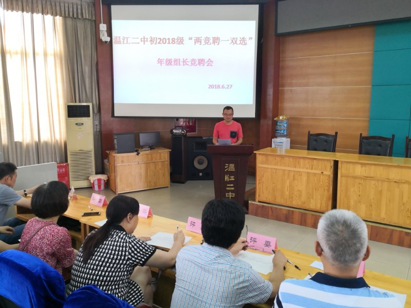 2018年6月27日下午3:00,在温江二中阶梯教室举行了《温江二中初2018级“两竞聘一双选”年级组长竞聘会》。竞聘大会的评委,由温江二中分管初中教育教学工作的副校长袁淑英、分管学校德育工作的副校长郭久清、教科室主任唐应树、分管年级领导教导处副主任李斌、学校工会主席王登明、教师代表杨丽萍、赖勇组成;武春城,刘晓莉两位老师担任计分员;大会由李主任主持。