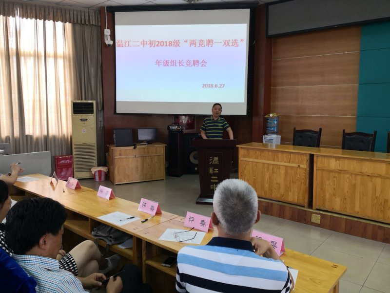 2018年6月28日下午5:30,在温江二中阶梯教室举行了《温江二中初2018级“两竞聘一双选”班主任竞聘会》。温江二中主管学校工作的校长季玲、分管初中教育教学工作的副校长袁淑英、教科室主任唐应树、分管年级领导教导处副主任李斌、学校工会主席王登明、新竞聘成功的年级组长万欣担任大会的评委;武春城,刘晓莉两位老师担任计分员;大会由李主任主持。11位教师抽签决定了演讲顺序,并认真发言。