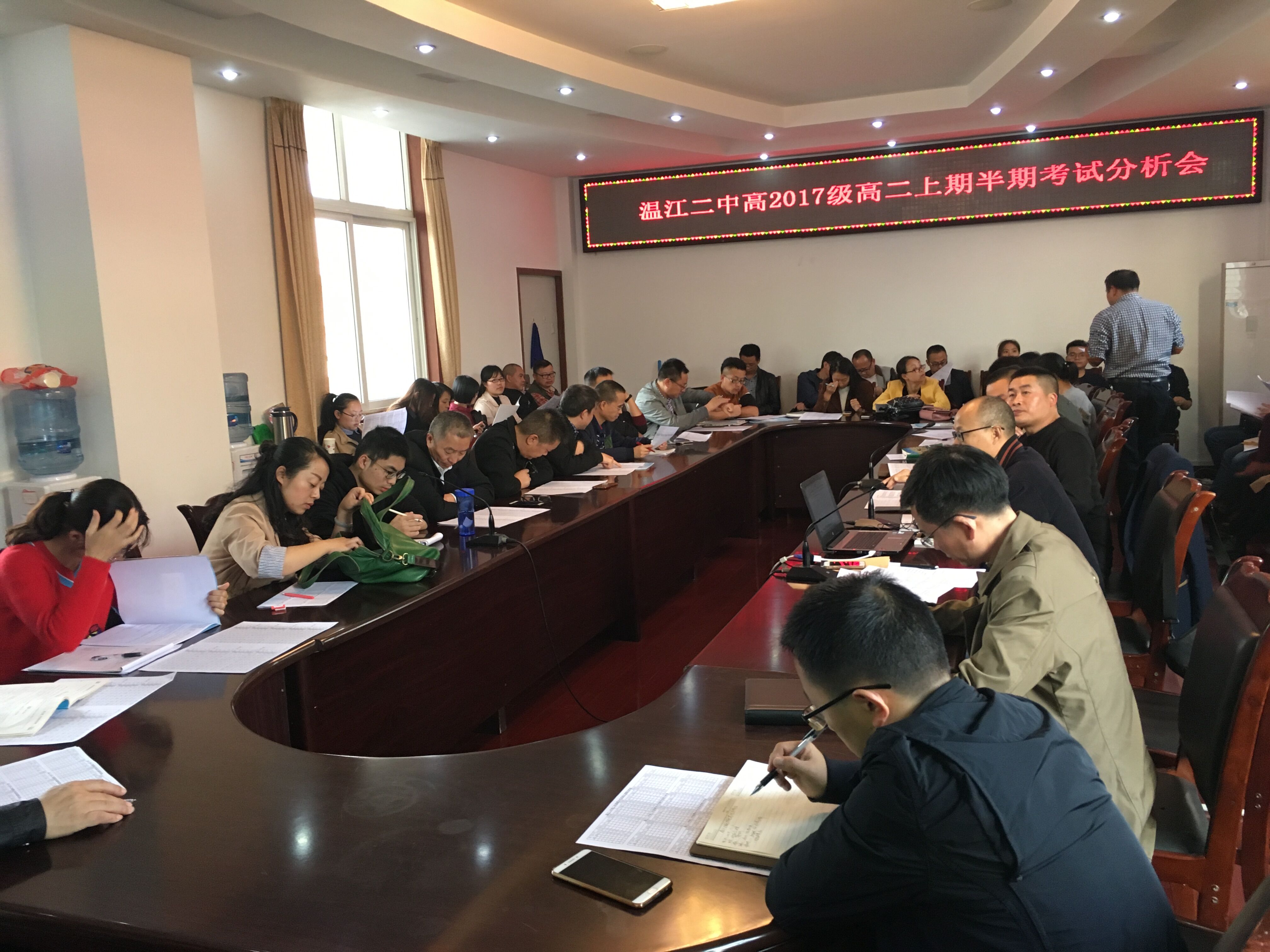 11月2日下午,温江二中高2017级高二上期半期考试分析会在学校综合楼四楼召开。年级组长谢刚主持会议,年级组长王光炜作考试数据分析,办公室主任田德义作重要提示,校长助理熊书钢提考后工作要求。