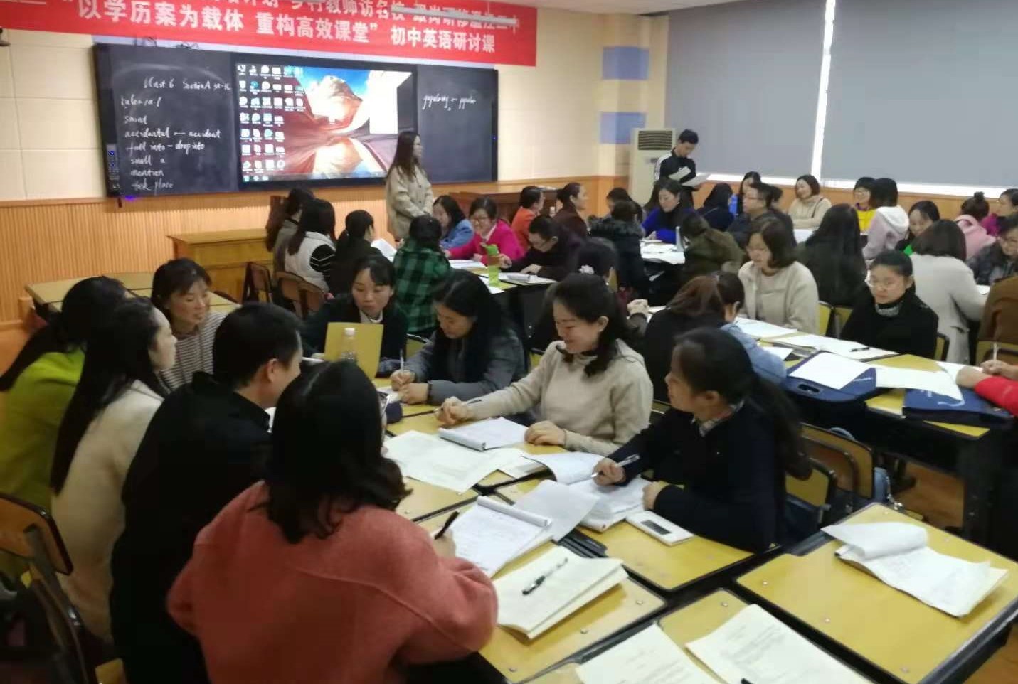 在全区各学校大力推进学历案的背景下,我校初中英语教研组通过精研课程标准及教材,结合学情,开展了《以“学历案”为载体,构建高效课堂》的学科课堂变革实践研究活动。这次活动得到了学校领导高度重视和区教研员杨立老师的大力支持。我校校长季玲、副校长袁淑英、副校长郭久清,教科室主任唐应树、教导处副主任李斌以及区英语教研员杨立老师全程参与此次活动。
