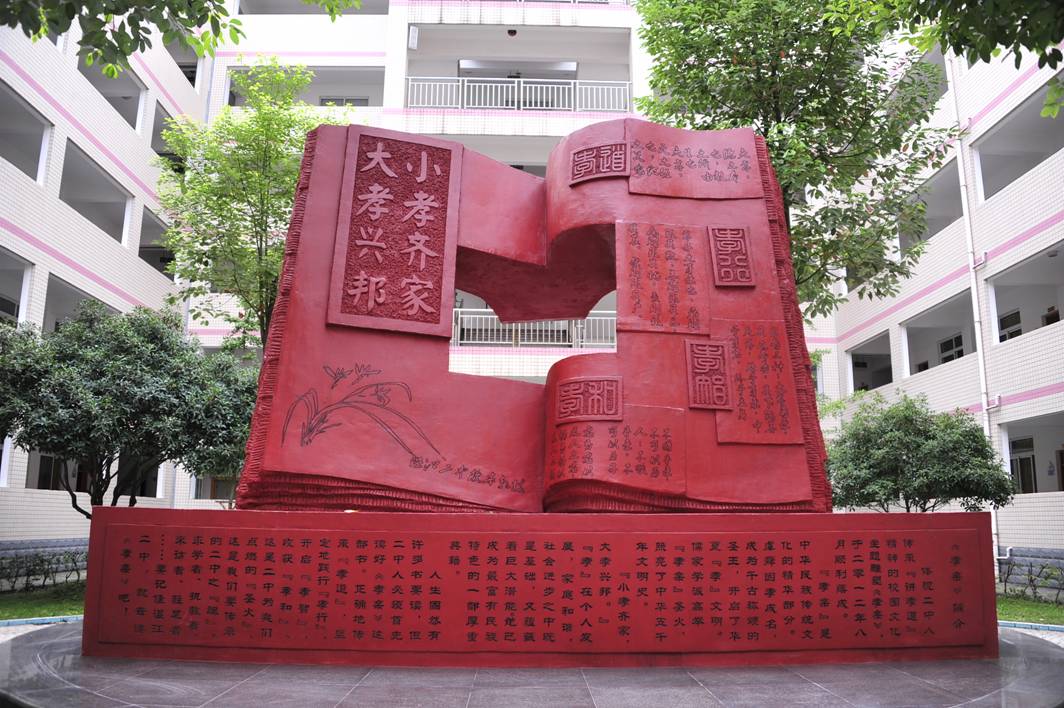 “孔子认为,“孝”是有层次的:低层次的孝是“养活父母”(这是孔子很瞧不起的);中间层次的“孝”是“孝敬”和“孝顺”,能做到就很不错了;而高层次的“孝”是能“继其志”。所以继承父母之志,“专心”学习,报效祖国和人民,是“人间大孝”。”这是温江二中“孝亲”雕塑中小孝、中孝和大孝的来源。