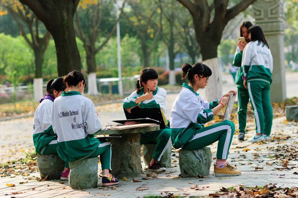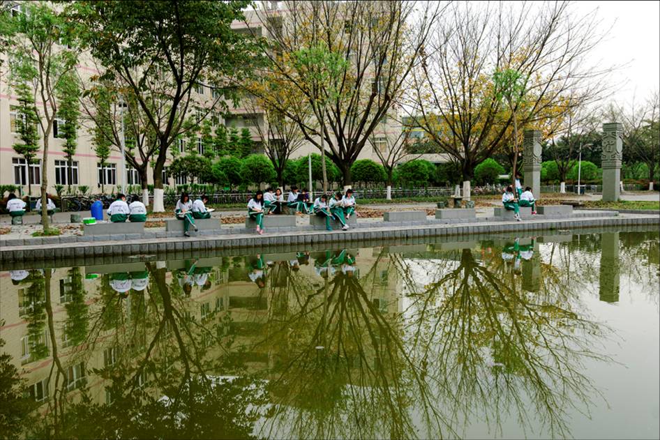 请看:在这风和日丽的下午,一位充满艺术活力的美术老师,带着一群风华正茂的青年学生,感悟美,表现美,为艺术人生,为理想,在校园里写生。清明节刚过,季春时节,桃红已褪,柳枝正绿,黄葛榕正在换装,黄叶随风飘落堆积地上,枝头的新芽、嫩叶茆足劲生长。柳池中成群结队的锦鲤自由地游来游去。同学们或坐在池边的长石条凳上,或坐在树下的花岗岩方凳上,读书长廊里,孝心亭中,三个一群,五个一组,正聚精会神、专心致志地画速写,写生掩映在绿荫中的孝心亭,科技楼,教学楼,孝行广场,“仁、义、礼、智、信”五德柱……“孝行父母方行天下,心法山川乃法万物”,“万家善出纯真孝,四季景生自然心”——孝心亭的两幅藏头对联分外醒目。耳濡目染在这绿化、文化的氛围中,校训“讲孝道、重人格、精学业、强体魄”的境界同学们孜孜以求。