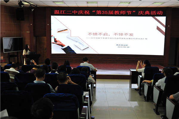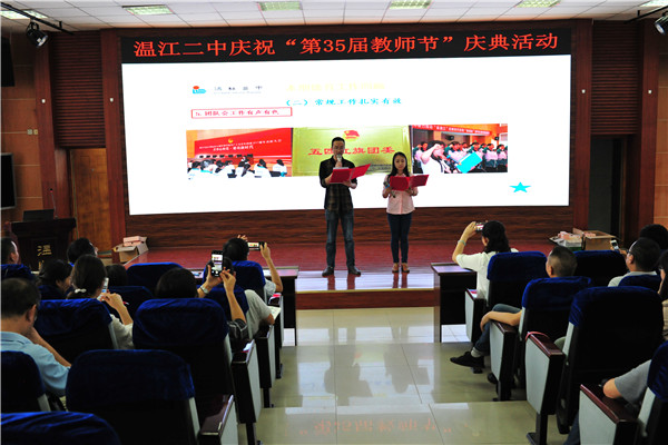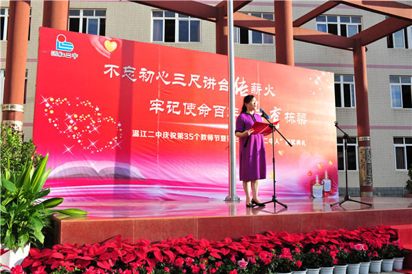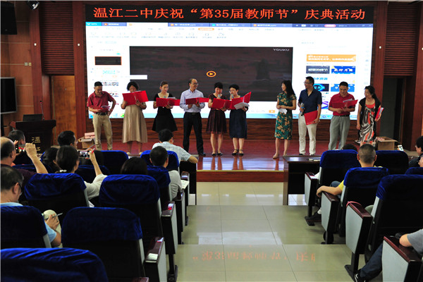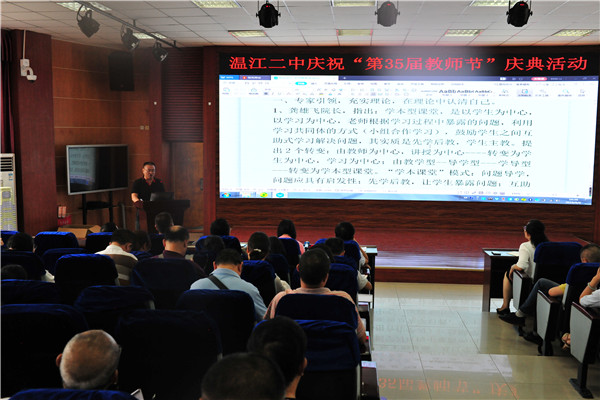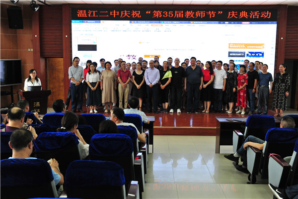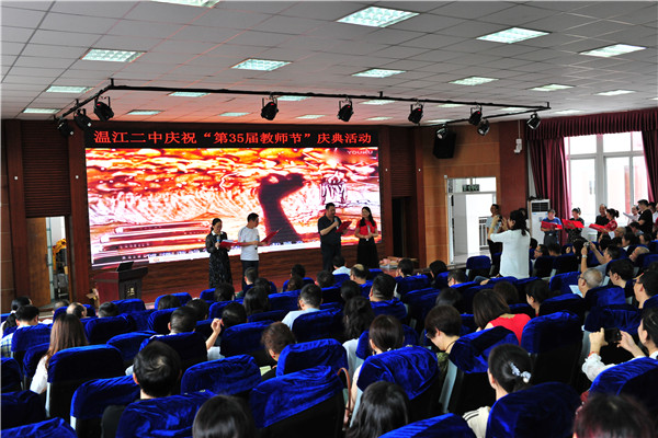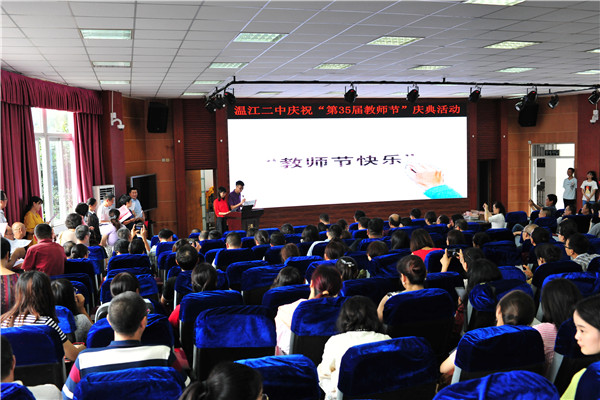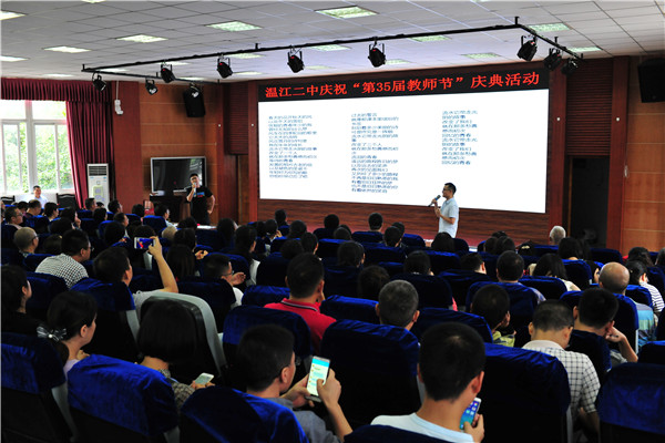 任岁月潺潺的流淌,不能忘怀的始终是老师的目光。它洞穿千年的风霜伴随着竹露的清响,带来朝露中第一缕阳光。它是春风中第一声布谷鸟的歌唱,是夏日里田田绿叶的荷塘,是秋空中渐渐淡去的雁行,是冬雪中悄悄绽放的芳香。9月9日下午,温江二中全体教师欢聚一堂庆祝第三十五教师节,庆祝我们自己的节日。