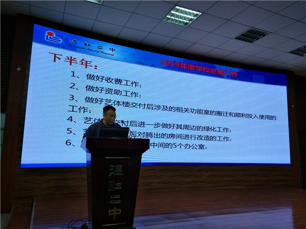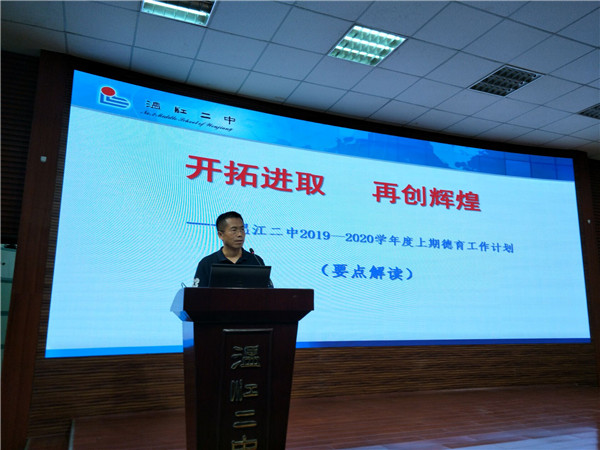 葱茏的树荫,涟漪的柳池,暂新的校园,在这美好的清晨,我们又要扬帆起航,去开创属于二中的明天。2019-2020学年度上学期的第一次教师大会在阶梯教室举行,会议由校长助理熊书钢主持。