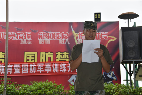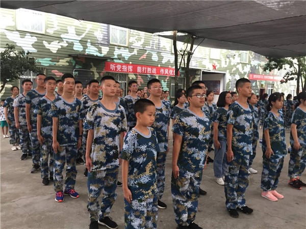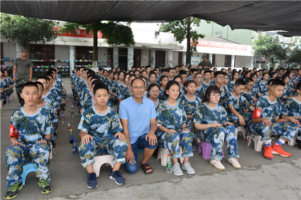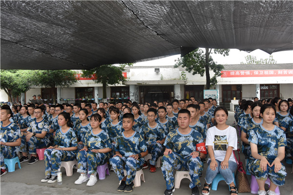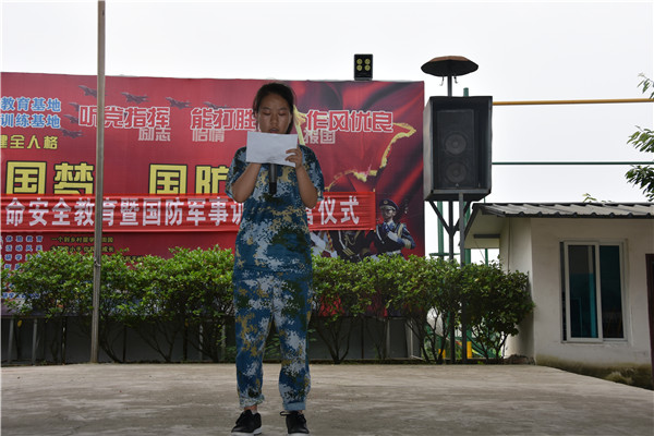 下午15:30,在激情的《三大纪律八项注意》军乐声中,温江二中2019年生命安全教育暨国防军事训练开营仪式如期举行,会议由基地教官主持。开营动员会上,授训教官代表宣誓:科学授训、安全第一,用认真的态度和严格的标准完成授训任务;高2019级1班学生代表庹丹妮代表二中学子宣誓到:“用心去投入训练,用汗水体验历练,刻苦训练、严守纪律、磨练意志、不怕困难,争做优秀学员!”同时,德育处主任王强代表学校作动员讲话,他首先向全体新生介绍了温江二中的基本情况,然后强调并要求同学们在六天军训生活中感悟军人情怀,学会吃苦耐劳,学会独立勤奋,做到不怕苦不怕累,高标准完成训练任务,用优异的军训成果做好8月31日的检阅汇报。全体带队班主任、学校校医、德育处干部和工作人员及基地授训教官等同志全程参与开营仪式。