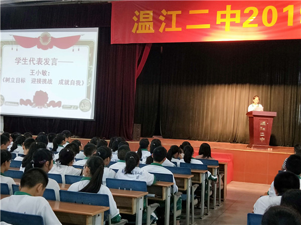 榜样的力量是无穷的,初三(3)班的王小敏同学作为学生代表做了题为《树立目标 迎接挑战 成就自我》的发言,她回顾了上个学期,师生们为打好中考首战——生物、地理会考,奋力拼搏,用汗水换来了优异的成绩。进入初三,面对繁重的学业和各种压力该怎么办?她是这样回答同学们的:制定符合自己实际的目标,写好规划书;要有脚踏实地的行动,把目标落实到每一天的学习中;严格要求自己的言行举止,遵规守纪。王小敏同学的发言激起了全体同学的豪情,每个班级依次激情满怀地用洪亮的声音地喊出了班级口号,展现了他们在进入初三学习生活中的精神风貌。