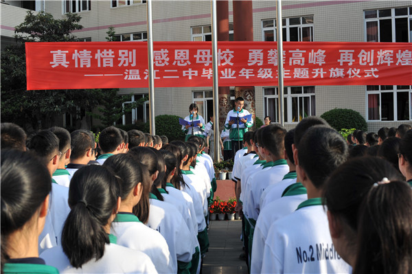 微风拂面,碧波荡漾,又是一年毕业季。6月3日,温江二中举行了一次特殊的升旗仪式,此次主题是“真情惜别,感恩母校、勇攀高峰、再创辉煌”。高三、初三的学子们将走进高考、中考的战场,开始人生新的征程。这一次升旗仪式,是告别,是祝福,更是激励。二中全体师生参加了升旗仪式,共同见证这一难忘而有意义的时刻。