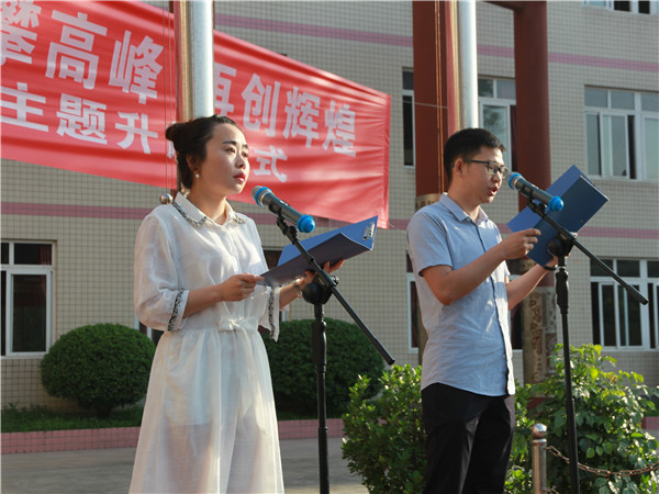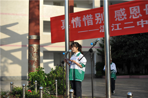 升旗仪式由高三10班的张红艳同学主持,这是她在二中主持的最后一次升旗仪式,主持之前,她表达了对学校提供这个机会的感激之情,同时表达了这会成为她最美好的回忆。张红艳同学的主持传达出了无限感动和深深依恋之情。