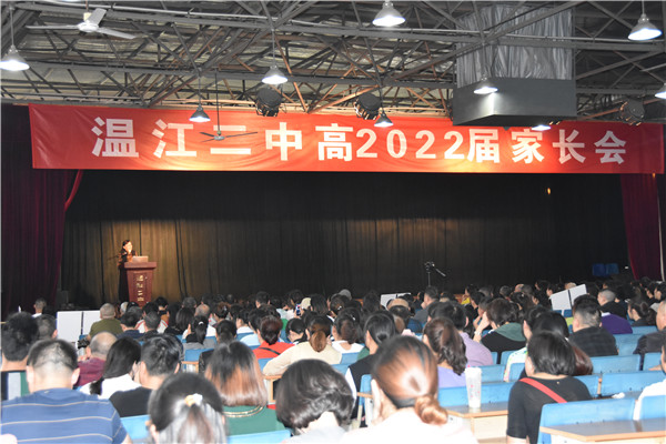 2019年10月12日下午,秋高气爽,风和日丽。温江二中高2022届在学校多功能厅召开了全年级第一次家长会,温江二中校长、党总支书记季玲,总务处主任赵大清,三位年级组长刘晓峰、屈忠和徐丽老师以及心理教师廖军和年级全体学生家长参加了大会,会议由年级组长屈忠老师主持。