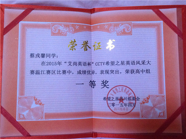 温江二中蔡戎馨同学荣获CCTV希望之星英语风采大赛温江区一等奖