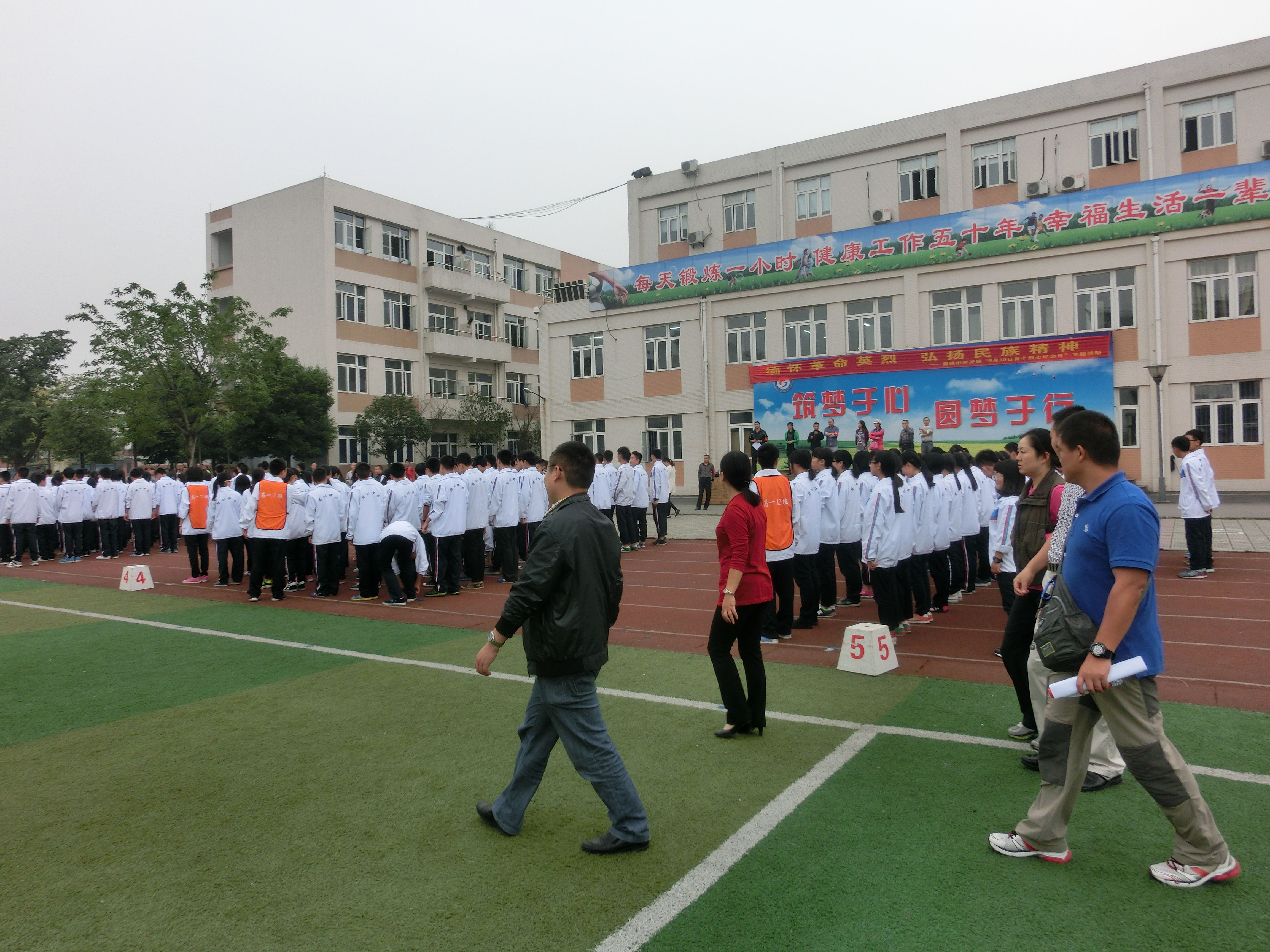 蜀城中学本次大课间比赛,由三个单元组成:第一单元,各班进、出场;第二单元,第二套广播体操表演;第三单元,以班为单位跑步锻炼。活动中,学生精神抖擞,步伐整齐,口号有力,给观摩教师会者留下了深刻的印象。比赛结束,两所学校的相关领导和体育教师进行了热烈的讨论和真诚交流。