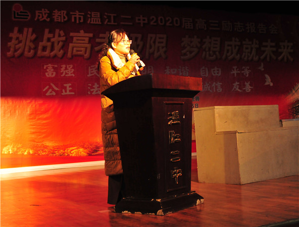 接着,高三英语组备课组长刘明翠老师发言。刘老师首先向同学们明确了成都“一诊”考试的功能和目的,指导学生们一诊考试后要对每一门学科进行深刻的反思和总结,抛弃过去,重新开始。刘老师的发言对学生们后期的学习有很好的指导作用。大会最后由年级组长兰健申明纪律要求,年级将进一步加强学习常规管理,为同学们营造良好的学习环境,用严明的纪律保障同学们高效的学习。