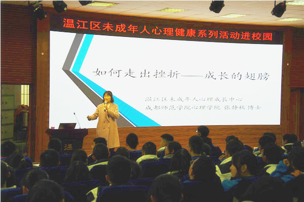 为进一步加强未成年人心理健康教育,促进未成年人健康成长和全面发展,使学生充分认识遇到挫折的必然性,学会积极应对并直面挫折,温江区文明办、区教育局联合在我校举办了“成长讲座:如何走出挫折——成长的翅膀”的心理健康教育专题讲座,我校高一年级200余名学生参与此次活动。