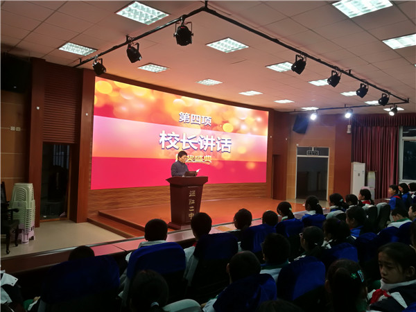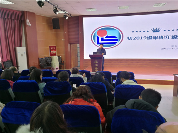为表彰优秀、鼓励先进、树立典型、鼓舞斗志,2019年11月20日,初一年级全体师生在阶梯式教室隆重举行了2019年上期期中考试成绩分析会暨表彰大会。会议由年级组长黄雁老师主持,副校长郭久清对此次期中考试成绩进行了全面的分析,从平均分、优生率、及格率、全科合格率等方面对比了上次月考的成绩情况,认真总结了半期以来工作中的得失,肯定了半学期来师生们的突出表现,指出了教师们在教育教学中存在的问题和不足之处。