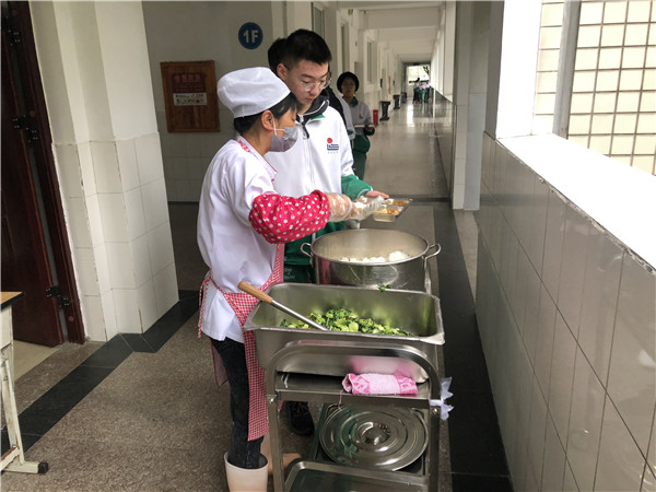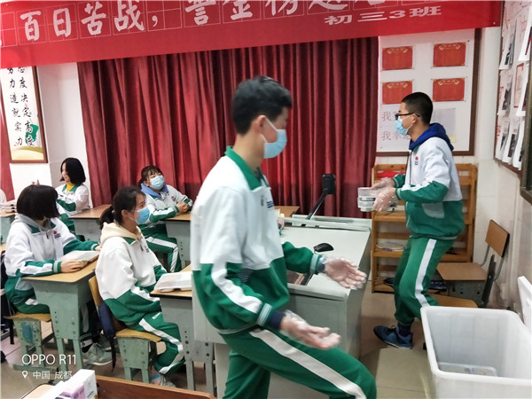 根据学校制定的就餐方案,初三学生在本班教室就餐。中午12:10,各班的领餐员洗手消毒,戴上手套,依次从取餐点领取本班的午餐,再分发给每一个同学,可口的饭菜为同学们及时补充能量。