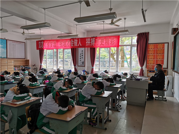 午餐后,班主任再次为同学们检测体温。13:10全年级同学开始午休,值班老师就成了“守睡人”。