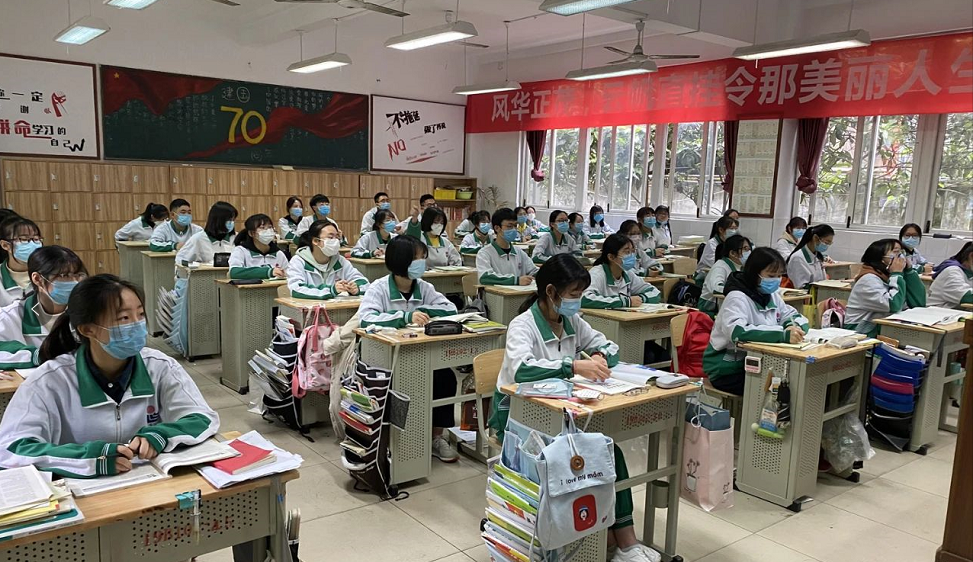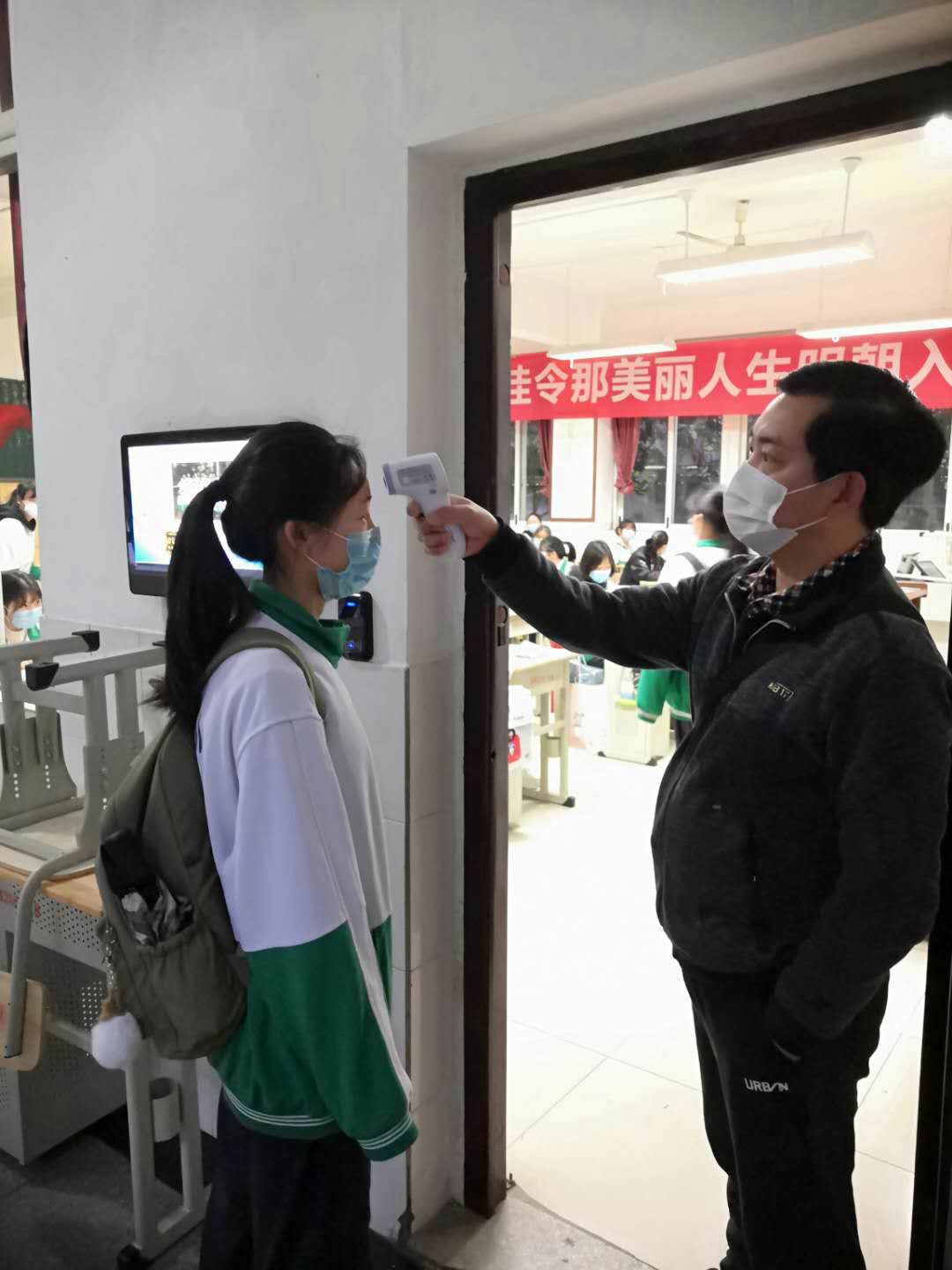 复学第一天,温江二中高三学子们怀着激动的心情,自觉排成队,有序接受工作人员测温安检,然后按照校园通道指示牌直达教室。学校全体行政、高三年级组长和全体班主任提前到位,保证了高三学生复学第一天能秩序井然地入校,精神饱满地上课。