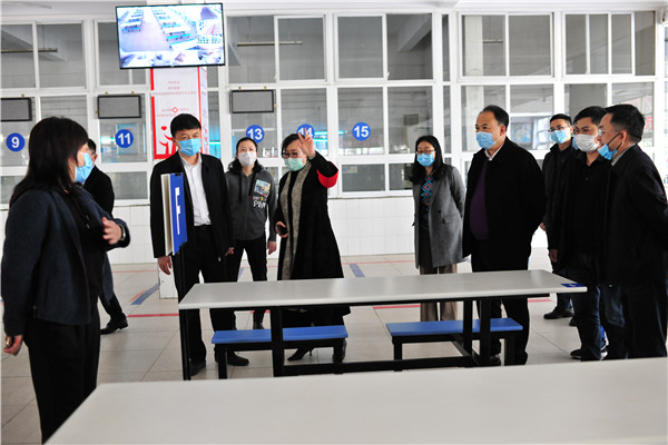 马区长一行人认真查看了教室、学生宿舍、餐厅等重点场所防控措施落实情况,全面了解了复学各项准备工作进展,详细询问了教学安排、学生管理、住宿饮食、生活保障等方面的具体措施。现场听取了季玲校长关于学校师生信息排查、物资筹备、师生住宿就餐、防控区域划分、应急处置程序等情况的汇报。