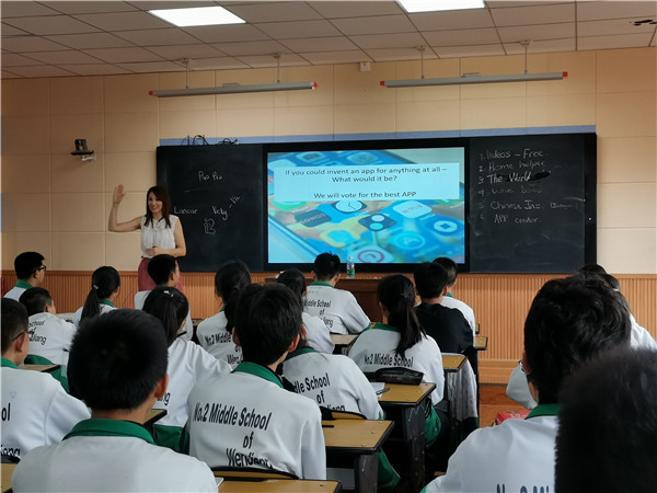 7月19日下午,金发碧眼,美丽大方的外教老师Vicky来到高2020级夏令营,和同学们度过了美好的两节课。一上课,Vicky老师就用她灿烂的笑脸,温柔的语言很快打消了同学们的陌生感和拘谨感,教学内容也围绕学生非常熟悉的手机APP展开,比如谈及手机APP的普及运用及带给生活的便利;如果只能在手机上保留三个APP,同学们会怎样选择;又如让同学们开发APP,大家会有怎样的想法等等。Vicky老师以游戏的方式让同学们用英语相互交流,用讨论的方式让大家发表观点作出选择,用随机发放卡片的方式确定发言人。尤其开发APP畅想环节,学生们脑洞大开,结合世界局势,科技前沿,生活起居等畅所欲言。尽管全程都是纯英语交流,但同学们积极踊跃发言,吐字清晰,表达流畅,课堂气氛热烈而欢快。