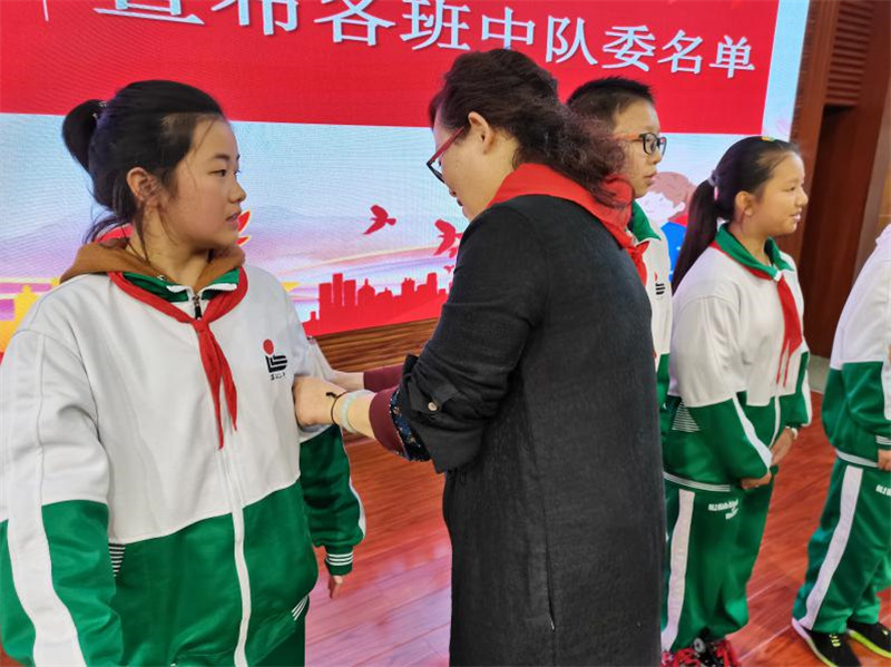 仪式上,少先队队员代表与会领导佩戴红领巾并互敬队礼。随后,郭校长宣布各班中队委名单并授予各班中队干部标志;唐主任宣布各中队辅导员名单,并颁发辅导员聘书。在精心准备诗歌激情高昂地朗诵后,季校长表彰学月优秀少先队员名单,并颁发奖状。最后初一年级李军组长对本年级同学提出要求和希望,希望同学们尽快适应小学到初中的各方面的转变。在学习态度上要被动转主动、课业量的少到多的适应、学习方法上的简单记忆到如何提高效率的转变等方面的过渡。